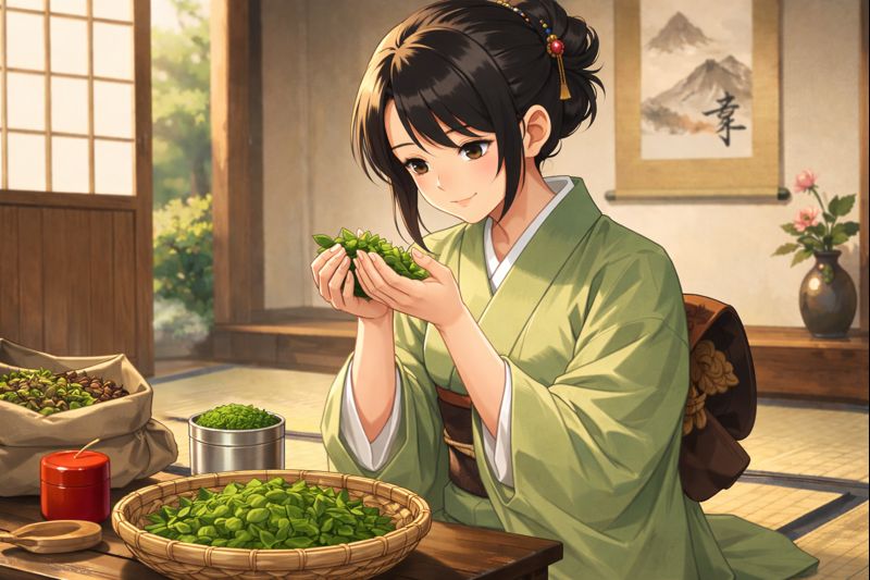 茶葉をじ~っと眺めているね🧐 そういえば、抹茶にはどんなメリットがあったんだっけ⁉️